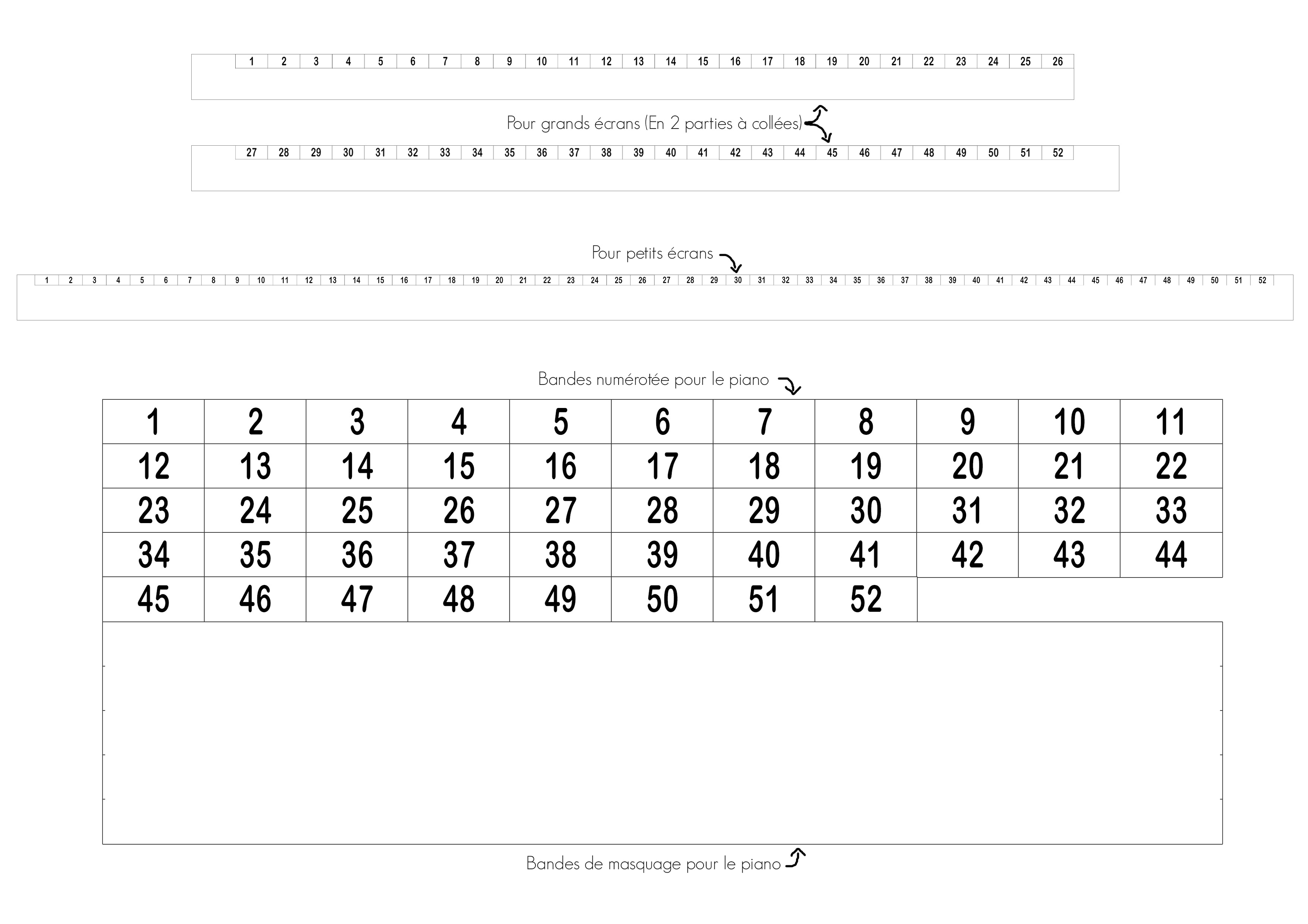 1. Imprimez, découpez, assemblez et coller les bandes sur votre piano de façon à pouvoir masquer les n° des touches avec la bande blanche :